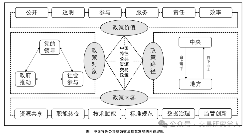 總體而言,我國公共資源交易政策發(fā)展的內(nèi)在邏輯可從政策價值、政策對象、政策內(nèi)容與政策路徑四個維度進行闡釋。就政策價值而言,呈現(xiàn)出公開、透明、參與、服務(wù)、責(zé)任和效率多重兼顧的導(dǎo)向;從政策對象來看,展現(xiàn)出黨的領(lǐng)導(dǎo)、政府推動和社會參與的多元協(xié)同模式;在政策內(nèi)容上,資源共享、職能轉(zhuǎn)變、技術(shù)賦能、標(biāo)準(zhǔn)規(guī)范、數(shù)據(jù)治理、監(jiān)管創(chuàng)新共同構(gòu)筑起六位一體的多元要素體系;就政策路徑而言,形成了中央自上而下的政策引導(dǎo)與地方自下而上的政策創(chuàng)新的雙重耦合機制。